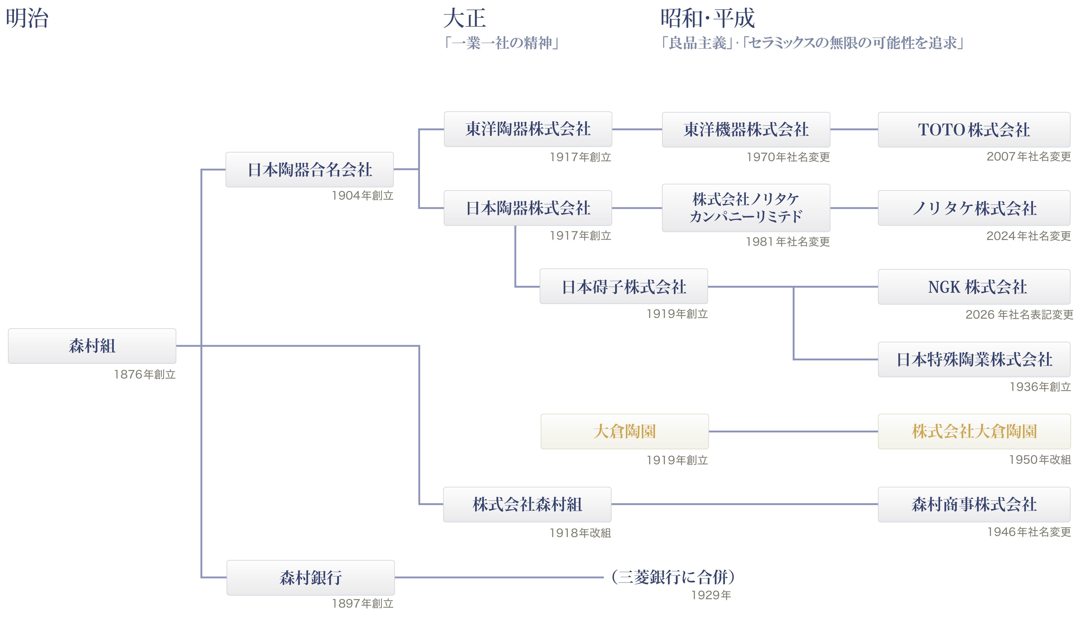 日本の貿易業界の草分けともいうべき「森村組」をルーツとした、森村商事株式会社、ノリタケ株式会社、TOTO株式会社、NGK株式会社、日本特殊陶業株式会社、株式会社大倉陶園の各社で世界最大のセラミック集団を構成しております。
